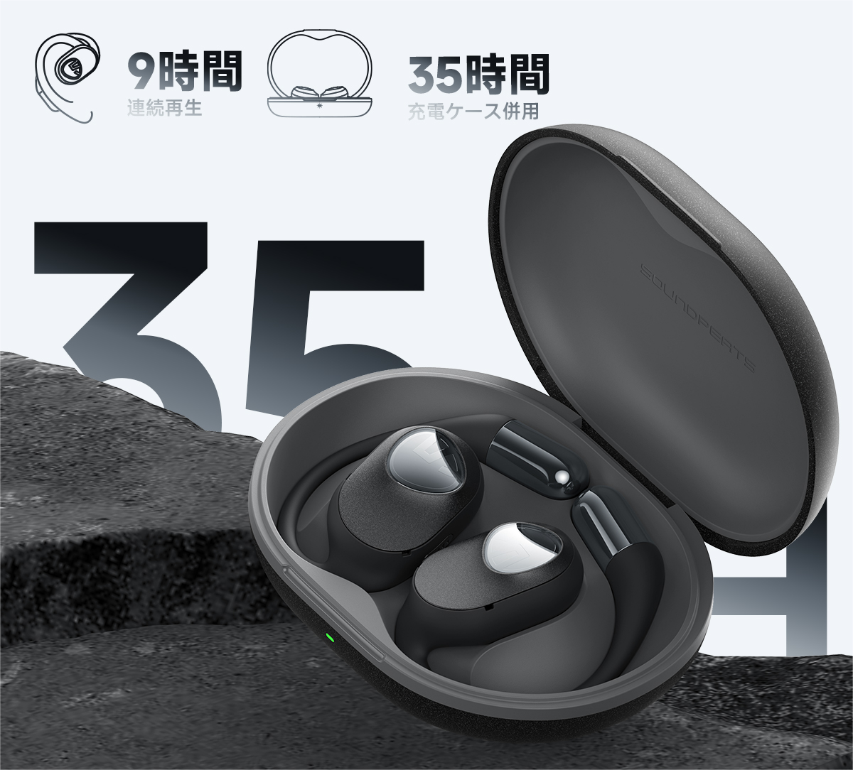 連続再生は9時間でケースを併用すれば35時間もちます。